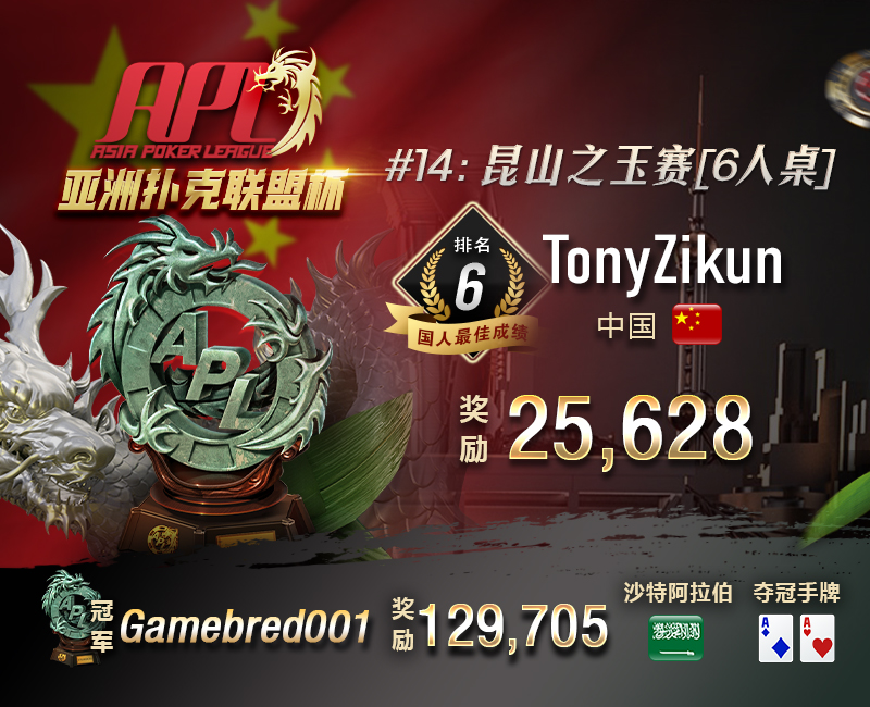 APL#14: 昆山之玉赛 [6人桌]由沙特阿拉伯玩家Gamebred001获胜,赢得129,705元奖励。