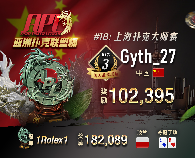 国人玩家Gyth_27成为APL#18: 上海扑克大师赛最佳成绩国人,荣获第三名,带走102,395元奖励!