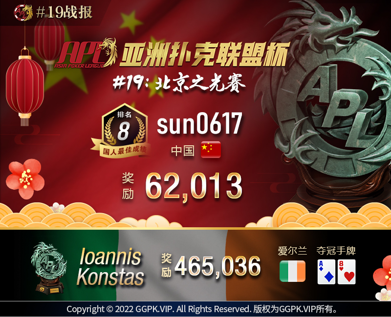 APL#19: 北京之光赛 竞争激烈,国人sun0617夺得第八名,获得62,013奖励。冠军由爱尔兰玩家 Ioannis Konstas夺下,斩获465,036奖励。